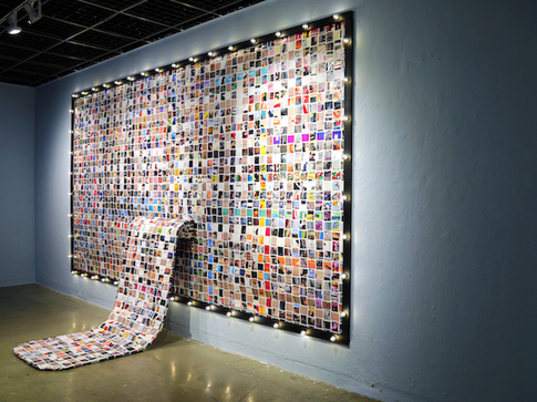 Cash register receipt paper, color ink on paper, lights, foam, plywood, metal hardware, tape, magnets, paint, glue